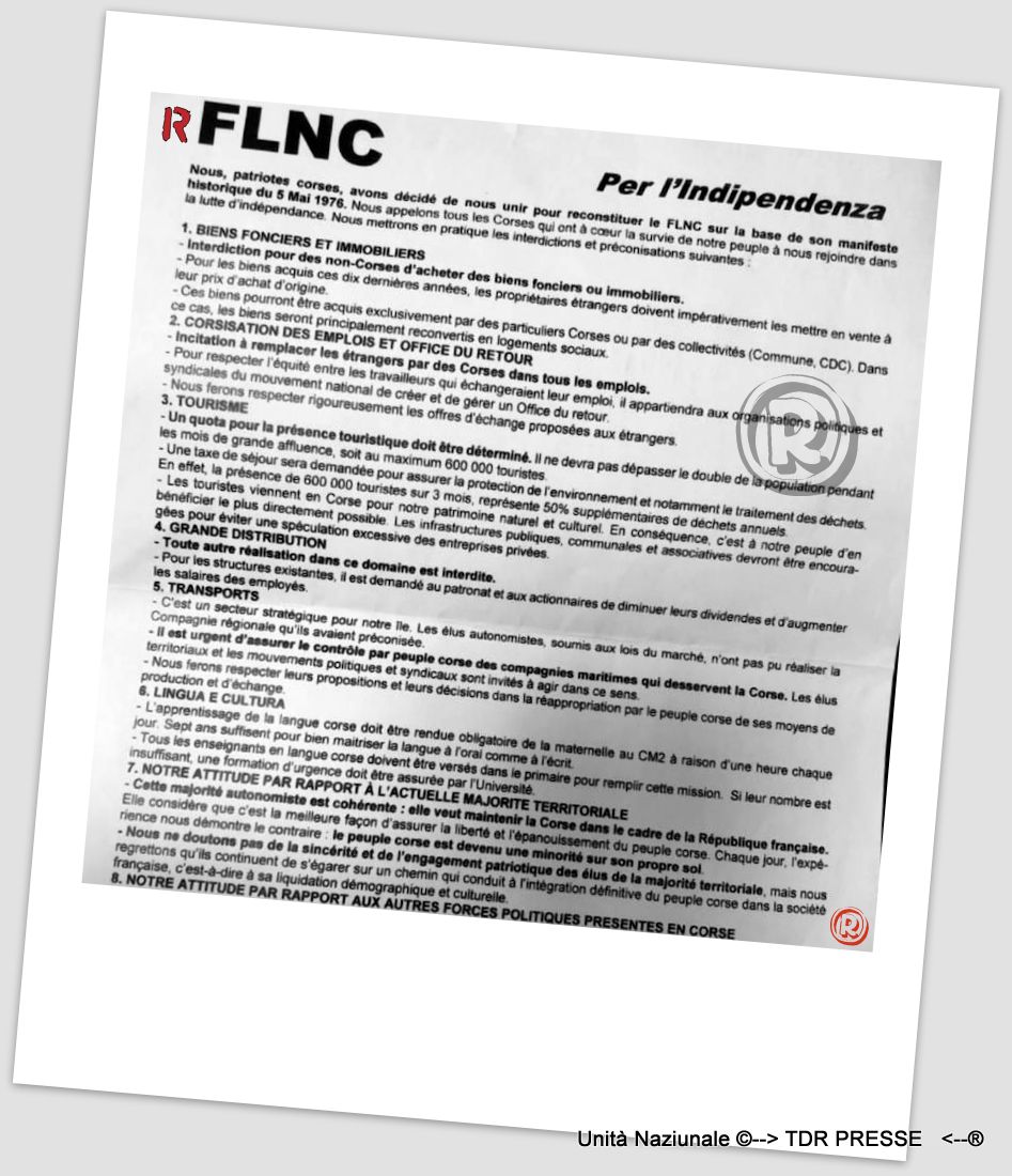 Nous, patriotes corses, avons décidé de nous unir pour reconstituer le FLNC sur la base de son manifeste historique du 5 mai 1976. Nous appelons tous les corses qui ont à cœur à la survie de notre peuple à nous rejoindre dans la lutte d’indépendance. Nous mettrons en pratique les interdictions et préconisations suivantes :