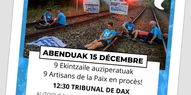 Pour cela, faisons nombre à Dax le 15 décembre 2022! Des bus seront organisés afin que nous puissions apporter notre soutien aux Artisans de la paix qui comparaîtront ce jour-là.