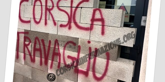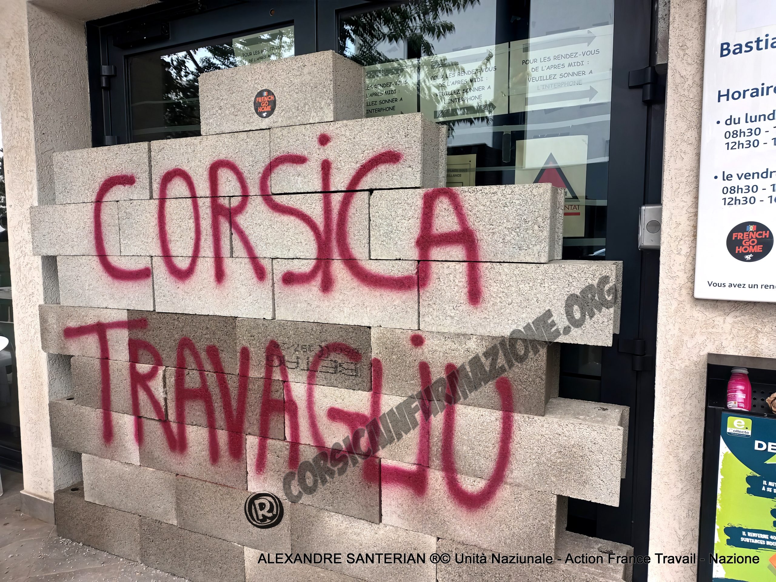 (Corse Net Infos) Nazione a rebaptisé ce samedi matin à Bastia les locaux symboliquement murés de France Travail en Corsica Travagliu, une inscription effectuée à la peinture rouge pour « dénoncer la politique de l’emploi menée en Corse par France Travail.