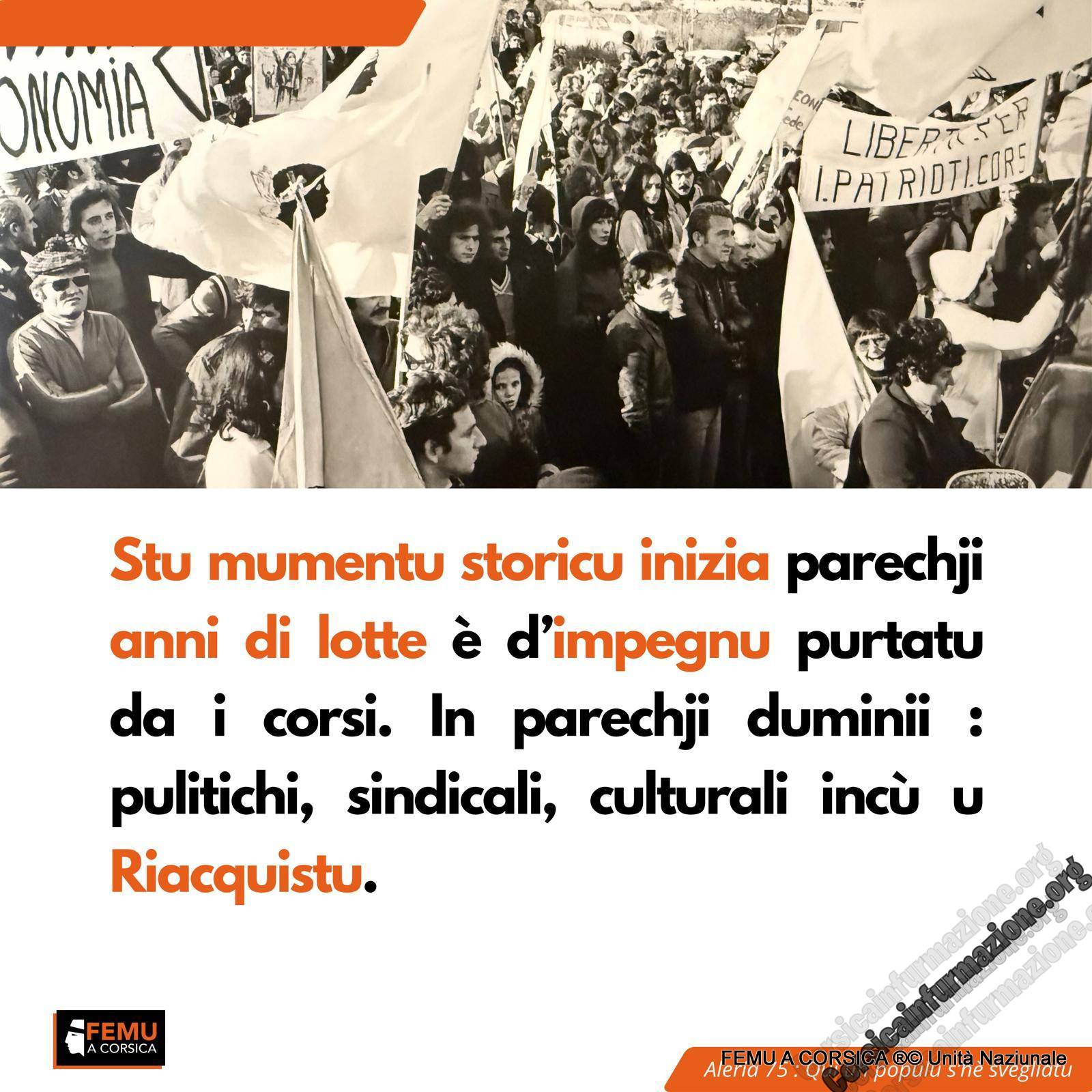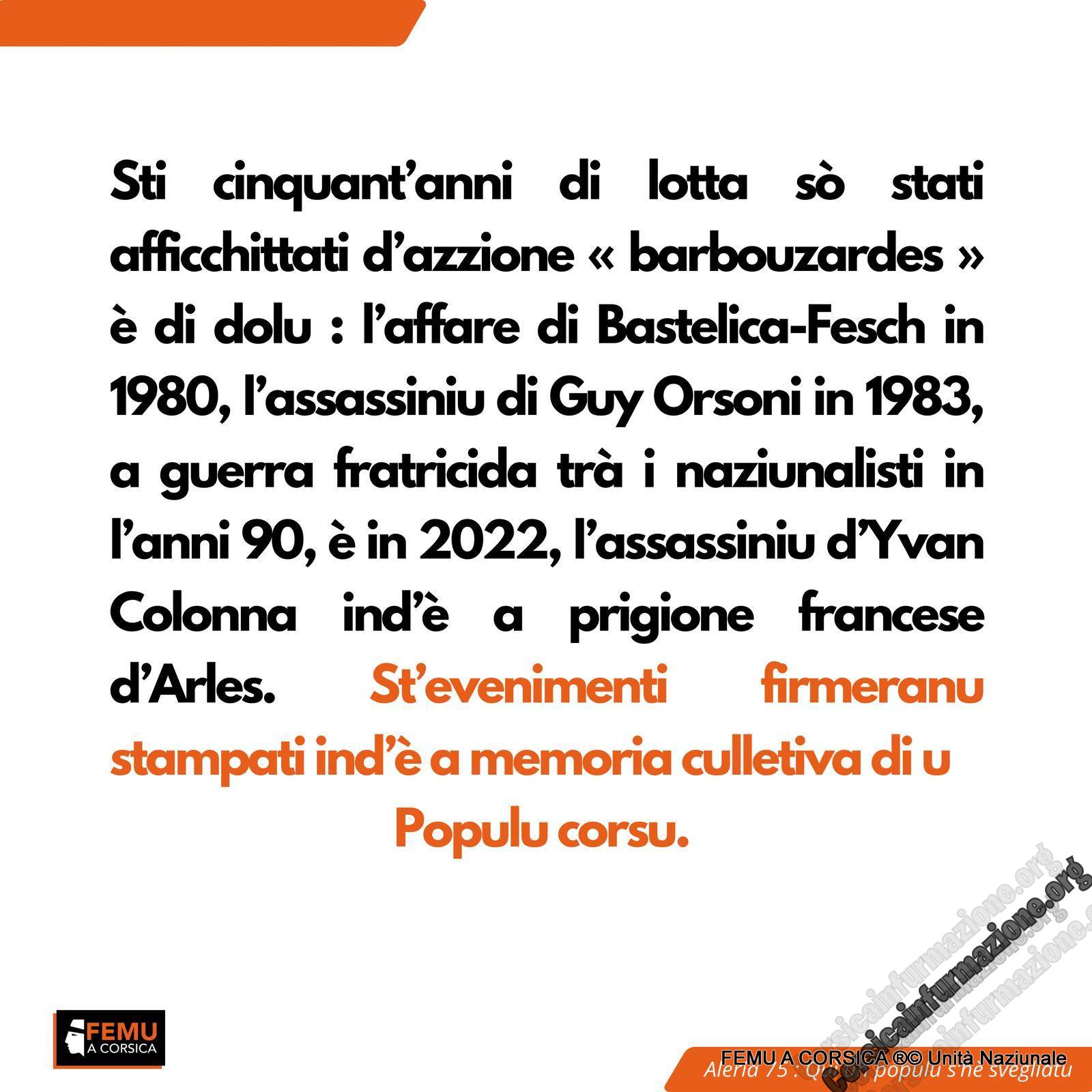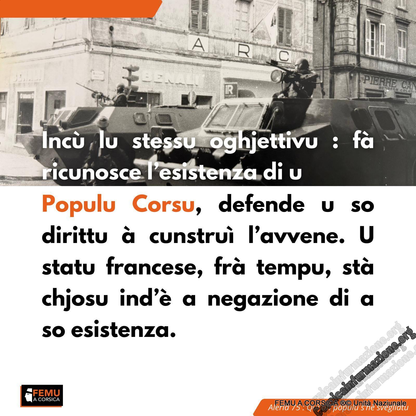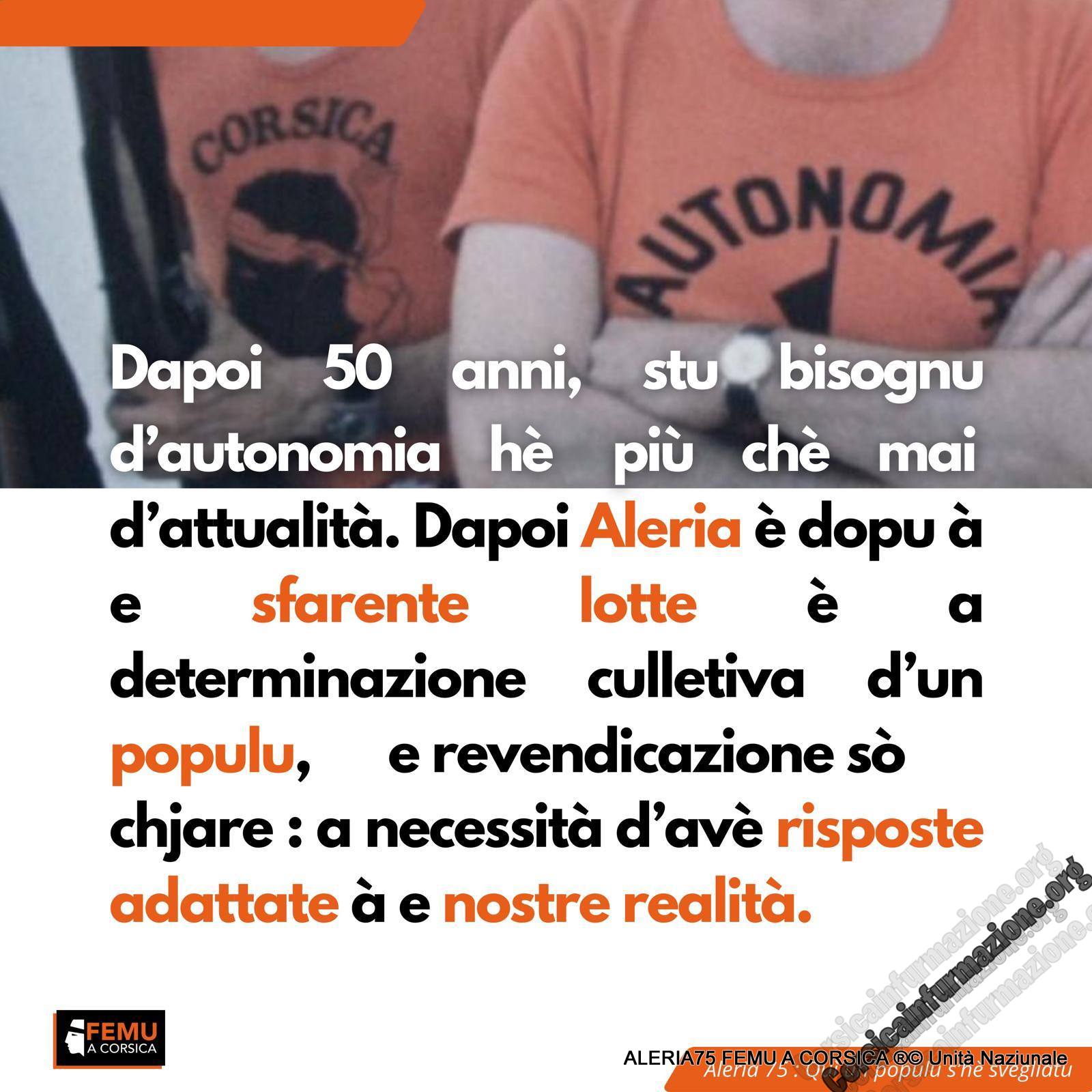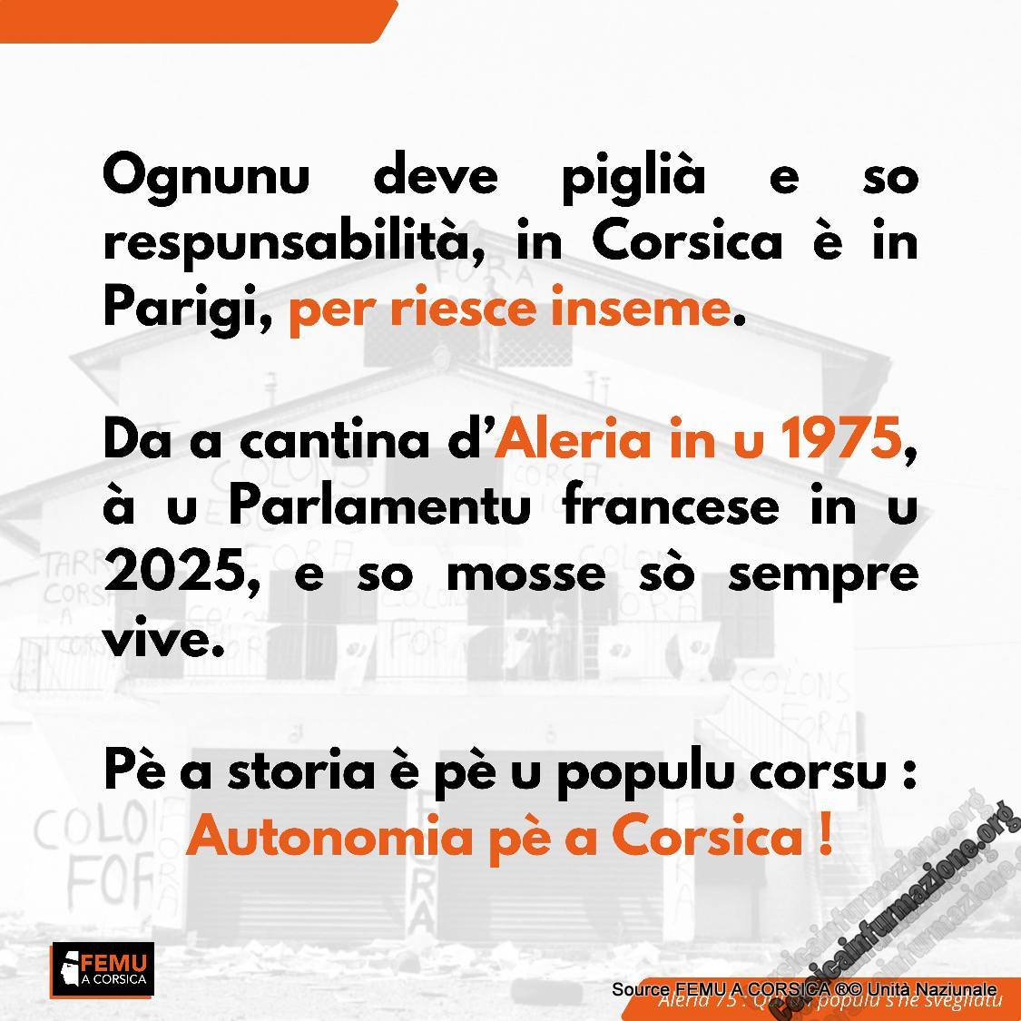 Aleria, memoria è cuscenza d’un populu ! Aleria fù, cinquant’anni fà, un avvenimentu decisivu, una scossa chì risvegliò un populu chì da troppu tempu campava in un sonnu di rivolta. Sti decennii di lotta inizianu è maturanu u fruttu di a ghjuventù militante, chì hà avutu u curagiu di fà u primu passu è di mette in i spiriti di i Corsi l’idea d’un impegnu culletivu in a Lotta di Liberazione Naziunale. Fubbenu elli, i primi, à sfidà a putenza francese nant’à a terra Corsa , terra Nostra, fendu nasce una cuscenza nova. Oghje, sta memoria ci rammenta ch’issa lotta ùn s’hè mai spenta, è chì fermanu vivi i so valori. Ùn ci vole mai à scurdà l’eroi d’eri, chì anu sacrificatu a so vita per un avvene più ghjustu è più degnu: per a Corsica Nazione. Dumane, v’invitemu à participà numarosi, à fianc’à noi e soprattuttu a fianc’à i nostri amichi di @associu_aleria75, à a cumemorazione di « i cinquant’anni d’Aleria ». Memoria viva per quelli chì anu datu tuttu à a nostra terra. O Corsu, ùn ti scurdà di a to storia, di e to radiche è di i sacrifizii chì anu custruitu a nostra dignità. A nostra cuscenza hè resistenza !