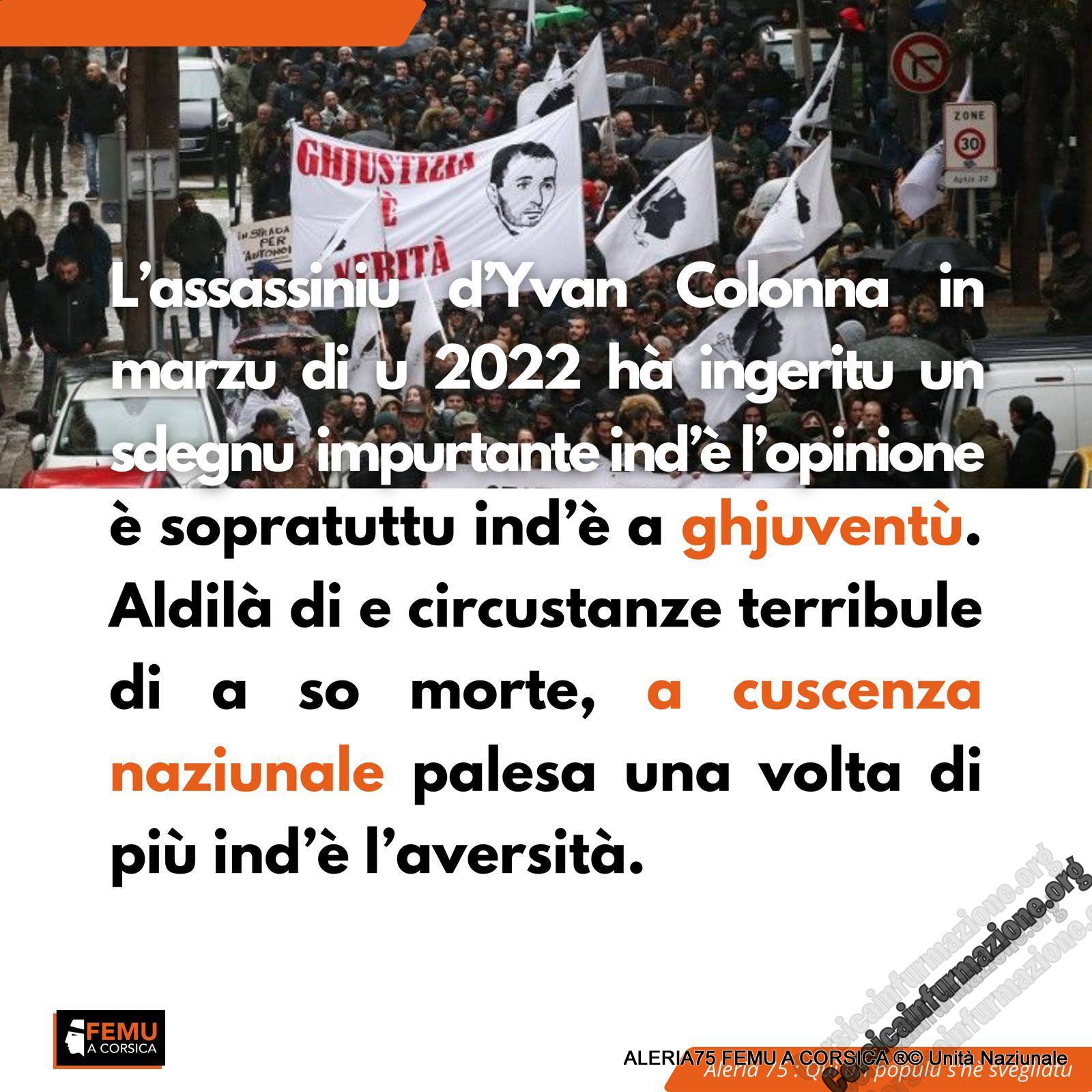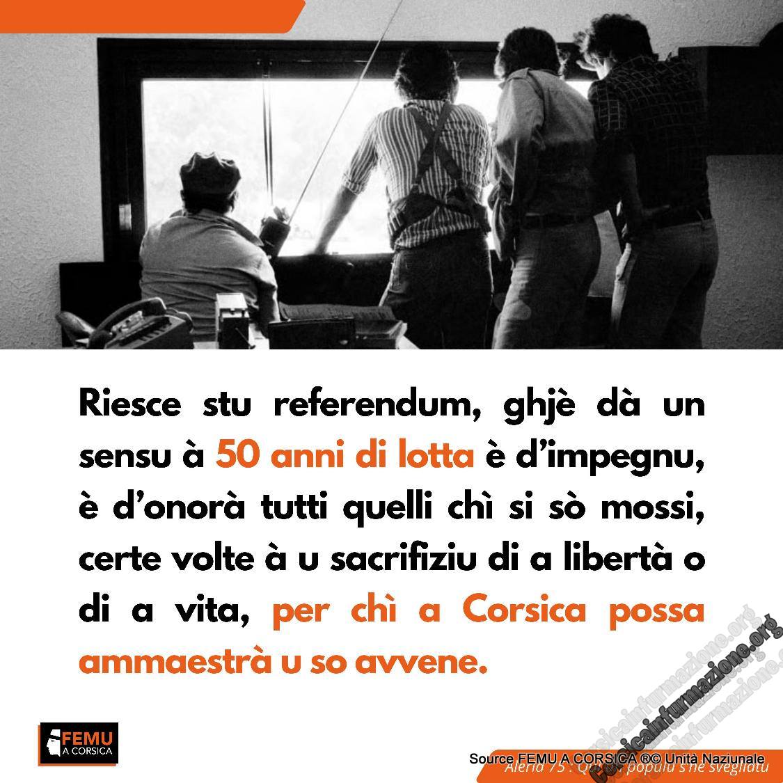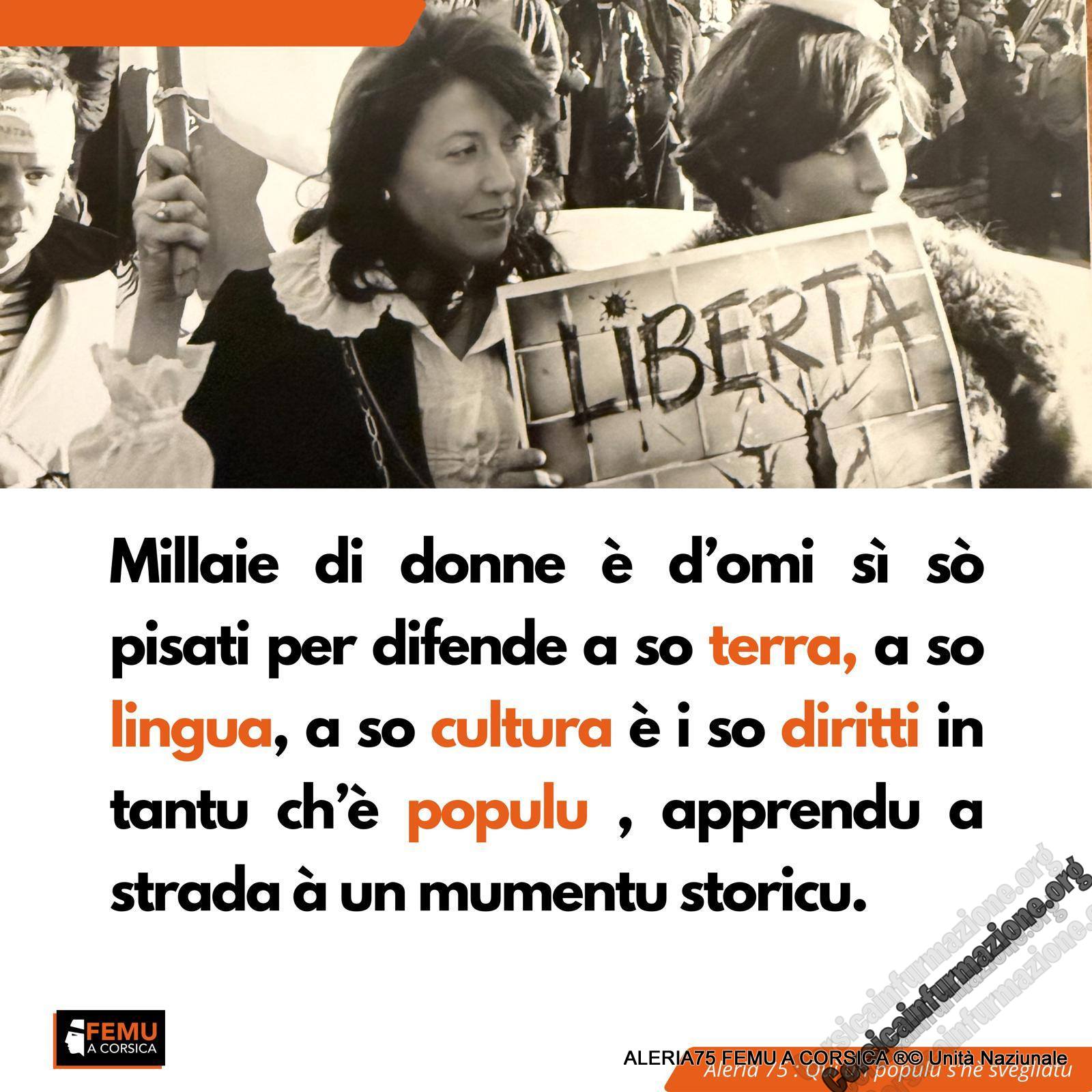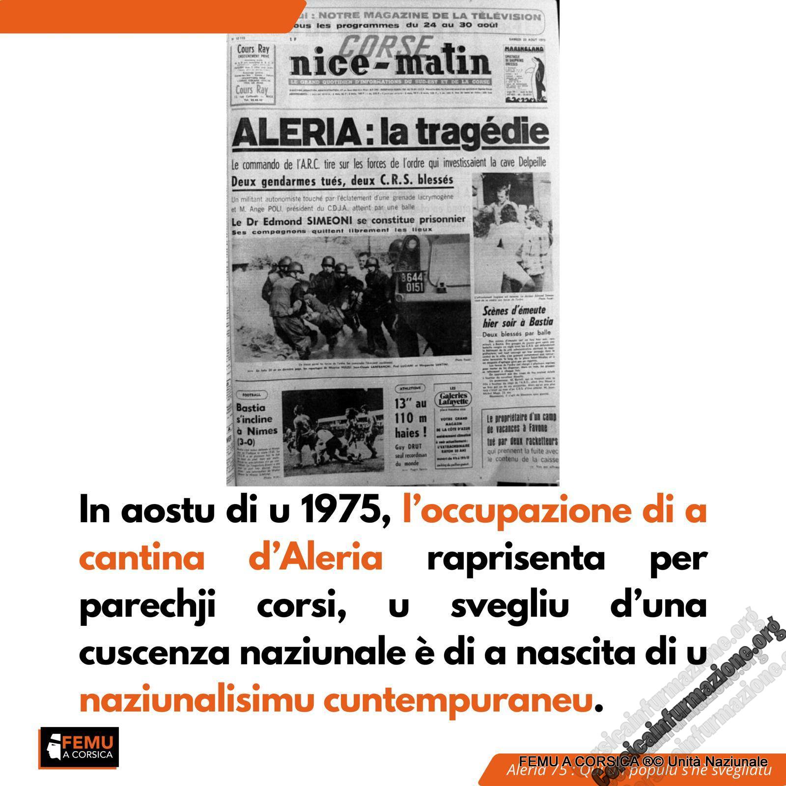 Aleria, memoria è cuscenza d’un populu ! Aleria fù, cinquant’anni fà, un avvenimentu decisivu, una scossa chì risvegliò un populu chì da troppu tempu campava in un sonnu di rivolta. Sti decennii di lotta inizianu è maturanu u fruttu di a ghjuventù militante, chì hà avutu u curagiu di fà u primu passu è di mette in i spiriti di i Corsi l’idea d’un impegnu culletivu in a Lotta di Liberazione Naziunale. Fubbenu elli, i primi, à sfidà a putenza francese nant’à a terra Corsa , terra Nostra, fendu nasce una cuscenza nova. Oghje, sta memoria ci rammenta ch’issa lotta ùn s’hè mai spenta, è chì fermanu vivi i so valori. Ùn ci vole mai à scurdà l’eroi d’eri, chì anu sacrificatu a so vita per un avvene più ghjustu è più degnu: per a Corsica Nazione. Dumane, v’invitemu à participà numarosi, à fianc’à noi e soprattuttu a fianc’à i nostri amichi di @associu_aleria75, à a cumemorazione di « i cinquant’anni d’Aleria ». Memoria viva per quelli chì anu datu tuttu à a nostra terra. O Corsu, ùn ti scurdà di a to storia, di e to radiche è di i sacrifizii chì anu custruitu a nostra dignità. A nostra cuscenza hè resistenza !