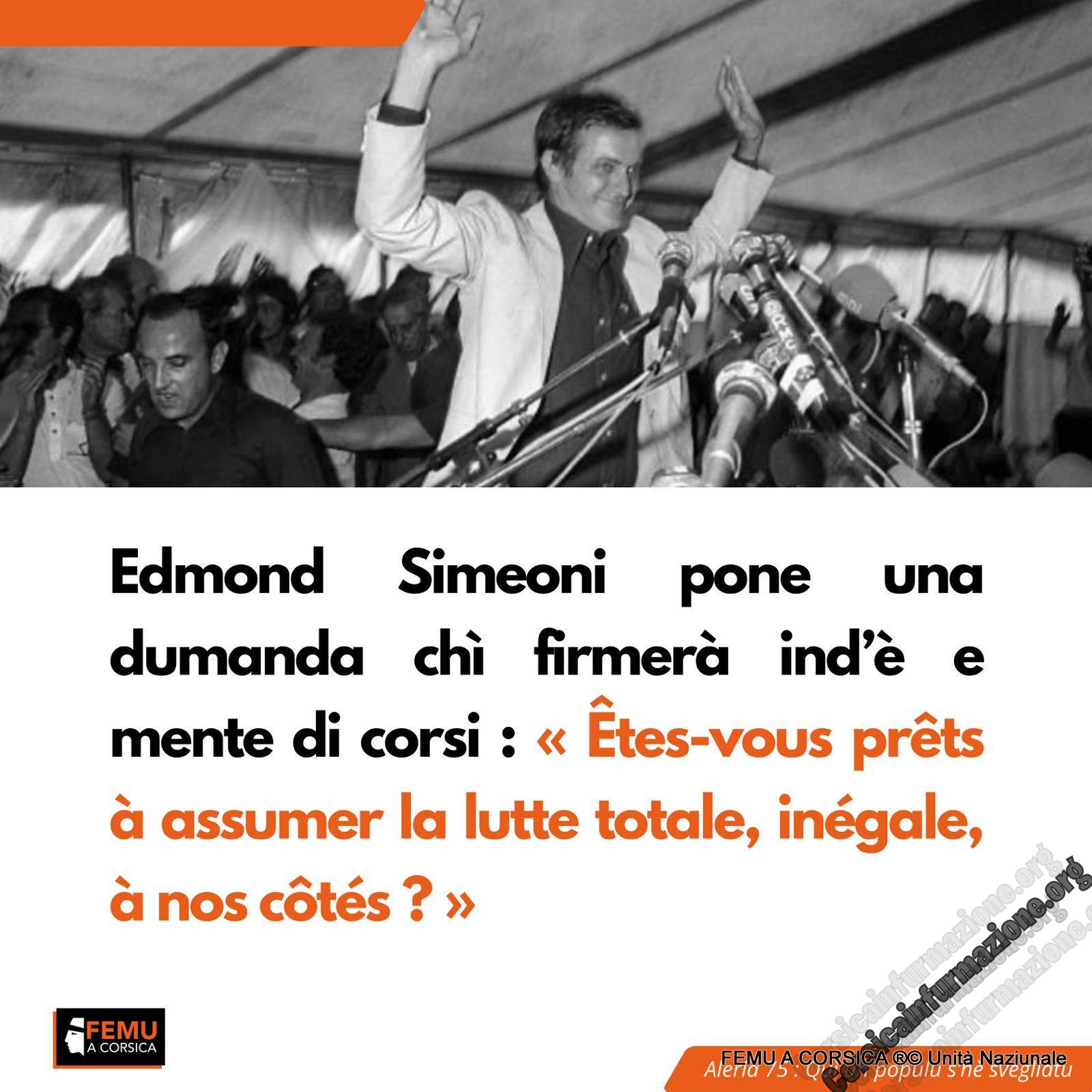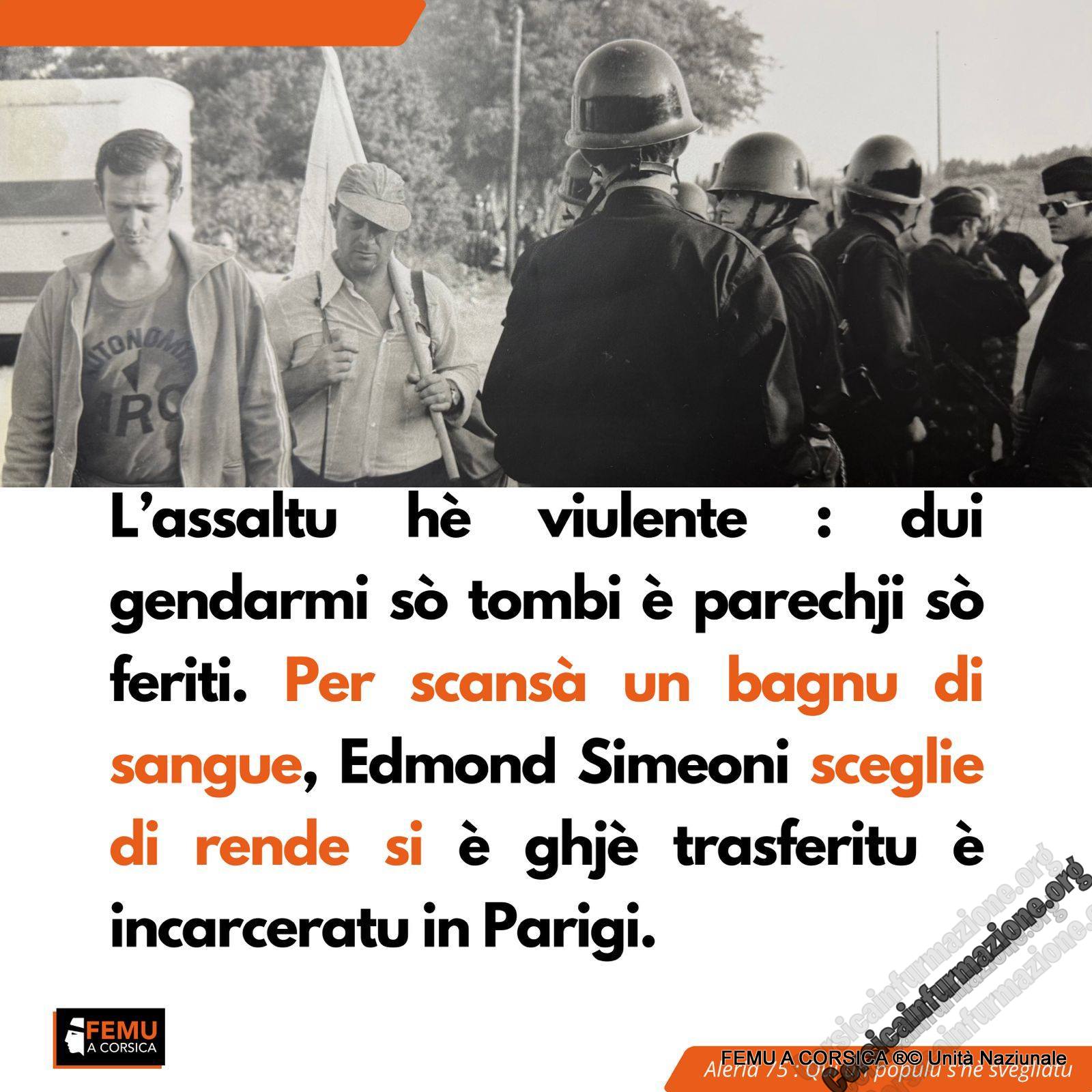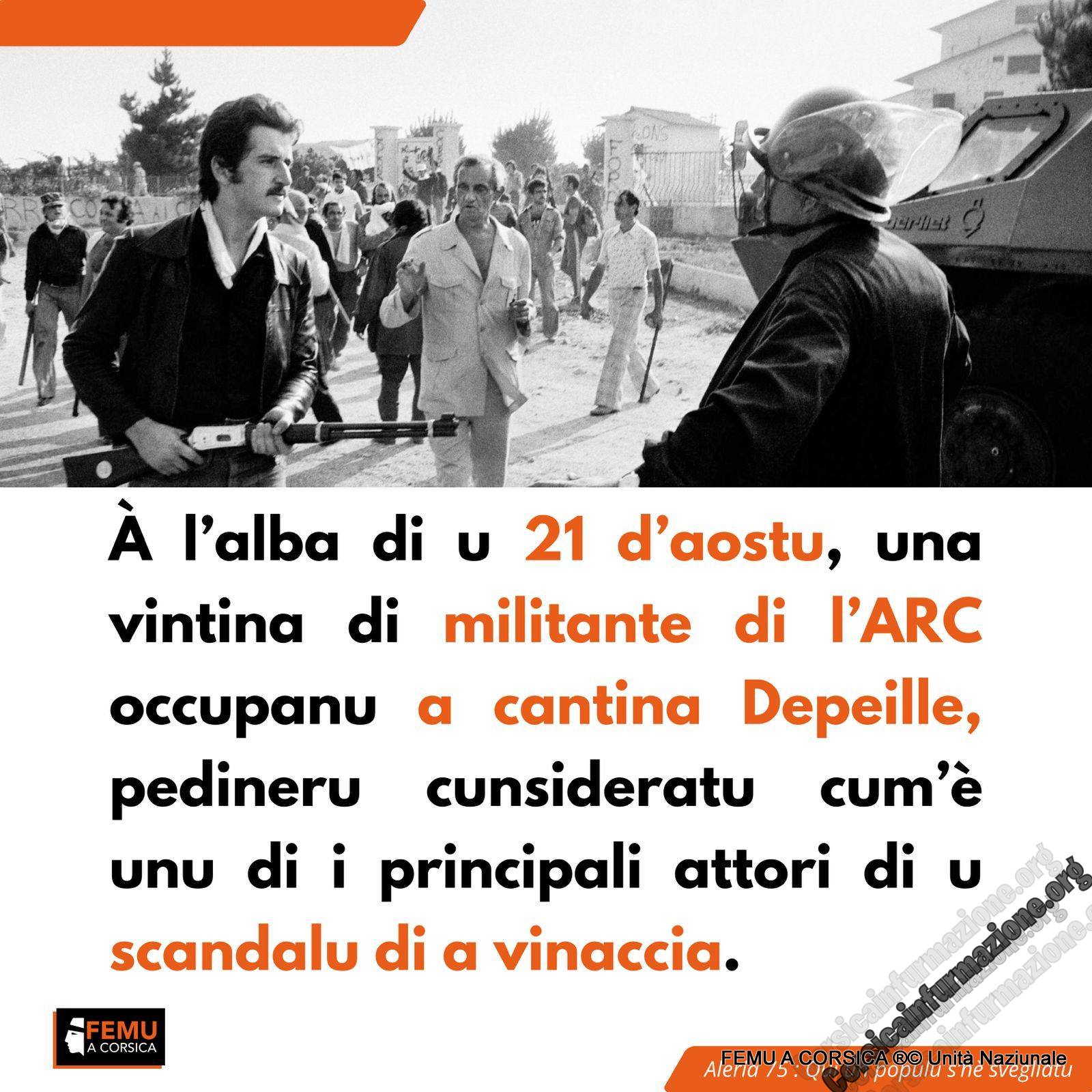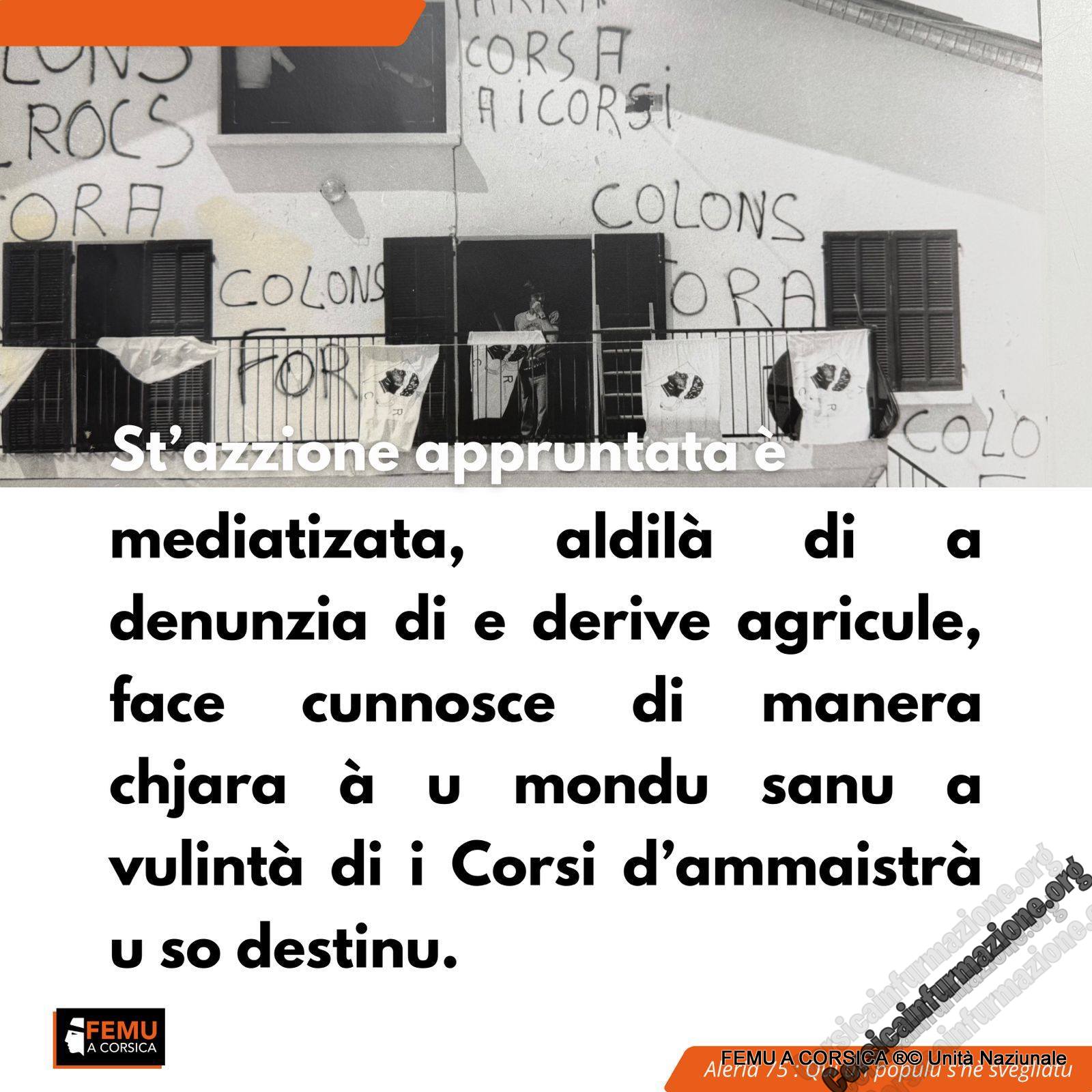 𝗔𝗟𝗘𝗥𝗜𝗔, 𝗨 𝟮𝟮 𝗗’𝗔𝗢𝗦𝗧𝗨 𝗗𝗜 𝗨 𝟭𝟵𝟳𝟱 « 𝘘𝘶𝘦𝘭’𝘷𝘦𝘯𝘯𝘦𝘳𝘪 𝘥’𝘢𝘰𝘴𝘵𝘶 𝘴𝘪 𝘥𝘪𝘴𝘤𝘪𝘵ò 𝘢 𝘴𝘵𝘰𝘳𝘪𝘢… » 50 anni fà, u 22 d’aostu di u 1975, i patriotti corsi, in giru à Edmond Simeoni, occupavanu, in Aleria, a cantina vinicula di u culunialistu Depeille. Aleria hè stata un mumentu maiò di e rivendicazione di u populu corsu è una tappa nova pè a Lotta di Liberazione Naziunale. Da stu solcu di rivolta di l’ARC, seguiterà, u 5 di maghju di u 1976, a creazione di u FLNC. Tenimu sempre à mente e parolle di Edmond Simeoni chì dichjarava chì « Ù𝘯 𝘴𝘪 𝘤𝘶𝘮𝘱𝘰𝘯𝘦 𝘮𝘪𝘤𝘤𝘢 𝘤ù 𝘶 𝘤𝘶𝘭𝘶𝘯𝘪𝘢𝘭𝘪𝘴𝘪𝘮𝘶 𝘧𝘳𝘢𝘯𝘤𝘦𝘴𝘦, 𝘴𝘪 𝘴𝘵𝘳𝘶𝘨𝘩𝘫𝘦 ». Core in Fronte saluta tutti quelli chì, in Aleria, anu apertu u chjassu di a storia è discitatu e cuscenze di pettu à l’oppressione francese. 50 anni dopu à Aleria, a Corsica ùn hè ancu autonoma. Centinaie di militenti anu cunisciutu a prigiò, a machja ò sò morti à u cumbattu pè a libertà di a Corsica. U discorsu è l’atti di u Statu francese sò sempre quelli di u culunialisimu. S’ella ferma a memoria, cuntinueghja, oghje, dinò, a lotta per a liberazione naziunale di a Corsica.