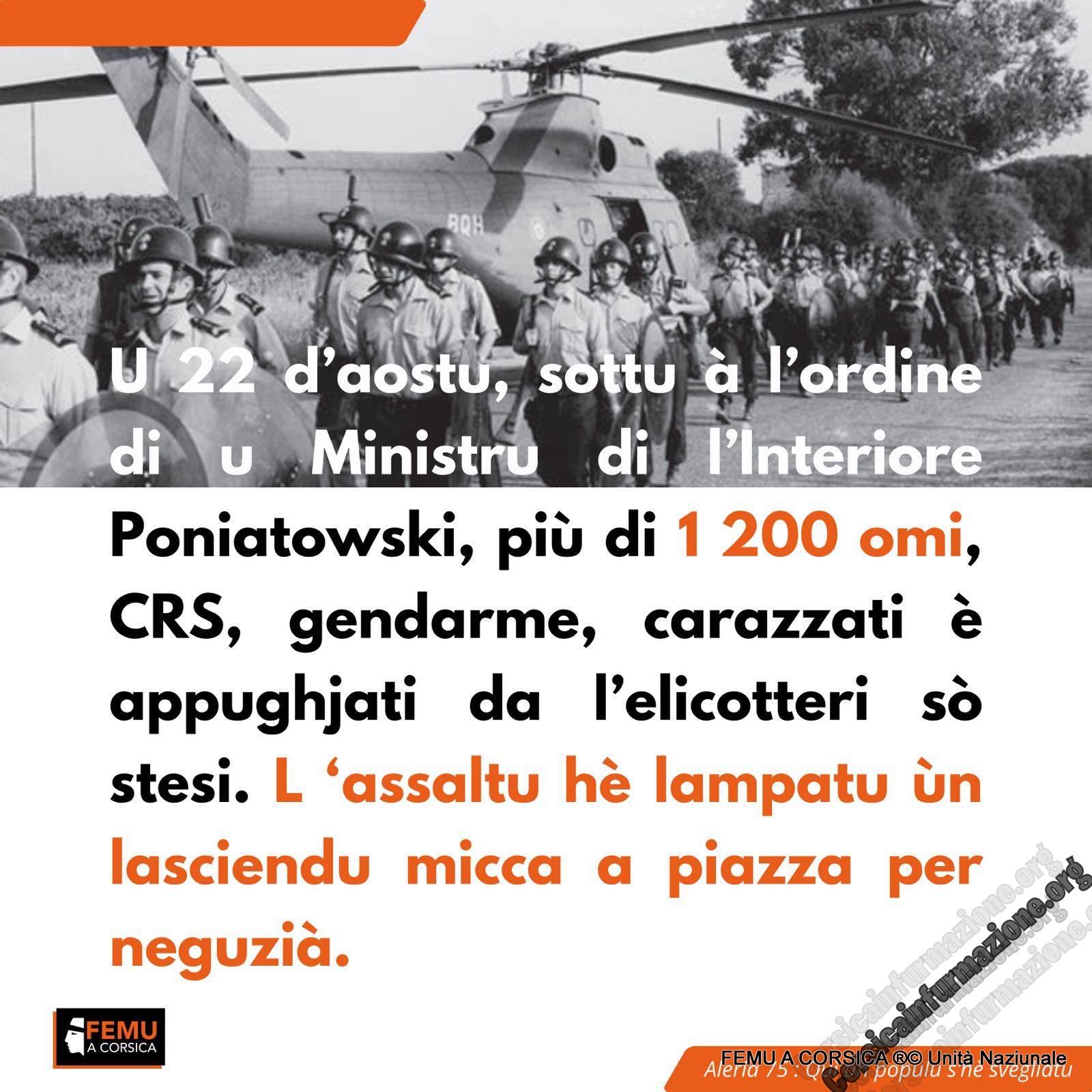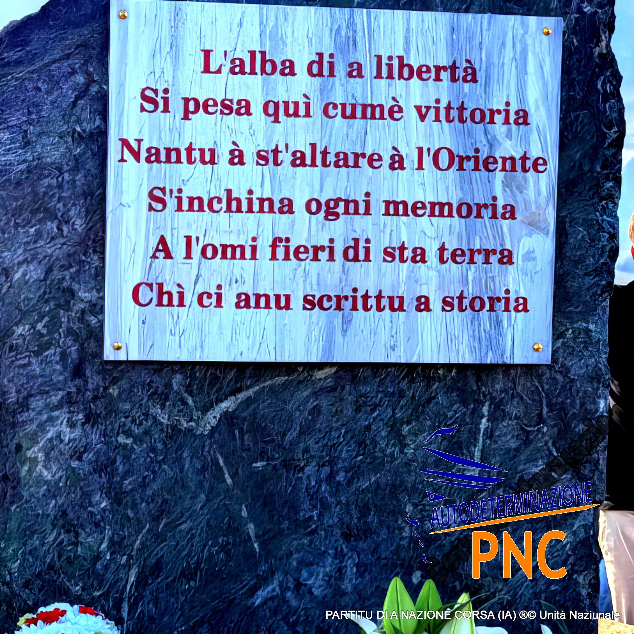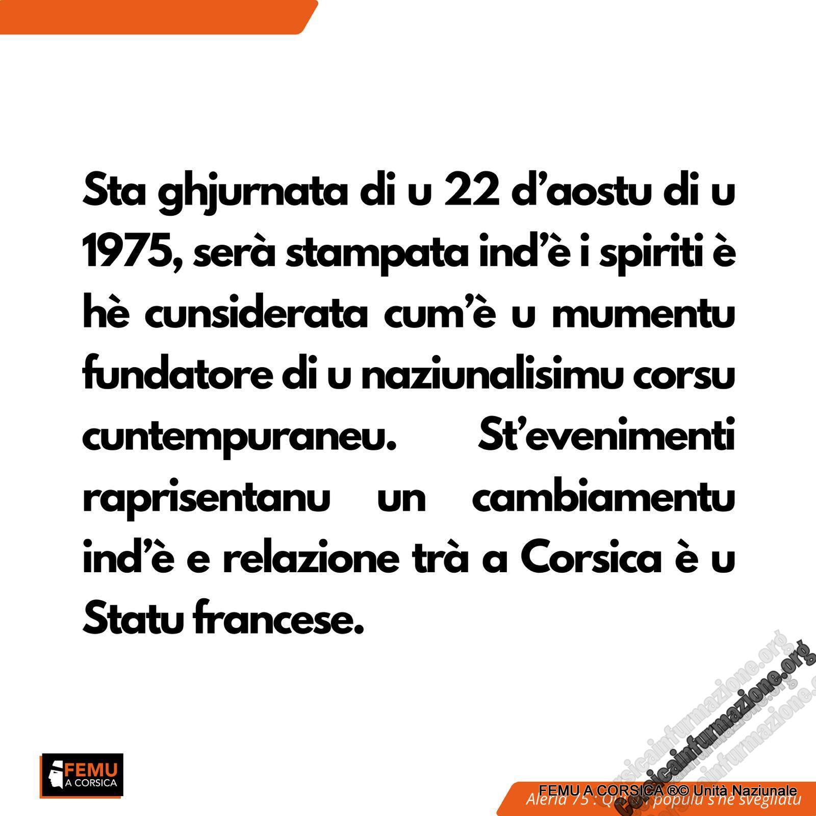 « Quellu venneri d’aostu Si discitò la storia La terra insanguinata Aprì la so memoria » Simu l’eredi di quelli chì si sò pisati sta mane d’aostu, quelli chì anu messu l’interessu cumunu cum’è primura di pettu à l’inghjustizia culunialista francese. Quelli chì avianu capitu ch’era ora per a Corsica di cunnosce un passu novu : l’emancipazione. U cumbattu d’Aleria hè statu un soffiu per a Lotta di Liberazione Naziunale chì ferma u nostru chjassu. Oghje, ogni corsu saluta u curaghju di st’eroi. Oghje, ogni corsu si ramenta di i sfarrenti guai ch’hà cunnisciutu u nostru populu per campà d’ellu solu. Oghje ogni corsu hà un ricordu vivu di i feriti è marturiati. U nostru dumane si ferà grazie à elli. Noi, vulemu esse l’eredi di ‘ssi guerrieri perchè ùn ci simu sminticati ch’ellu perdura stu cumbattu principiatu un mezu seculu fà. Ùn ci simu sminticati chì e rivendicazioni di prima sò sempre d’attualità. Ùn ci simu sminticati chì a lotta hè d’ogni ghjornu è ch’ella ha da esse purtata senza stanciata è malgratu i sacrifizi. « Eddi l’archaichi, i tonti, i nucenti »