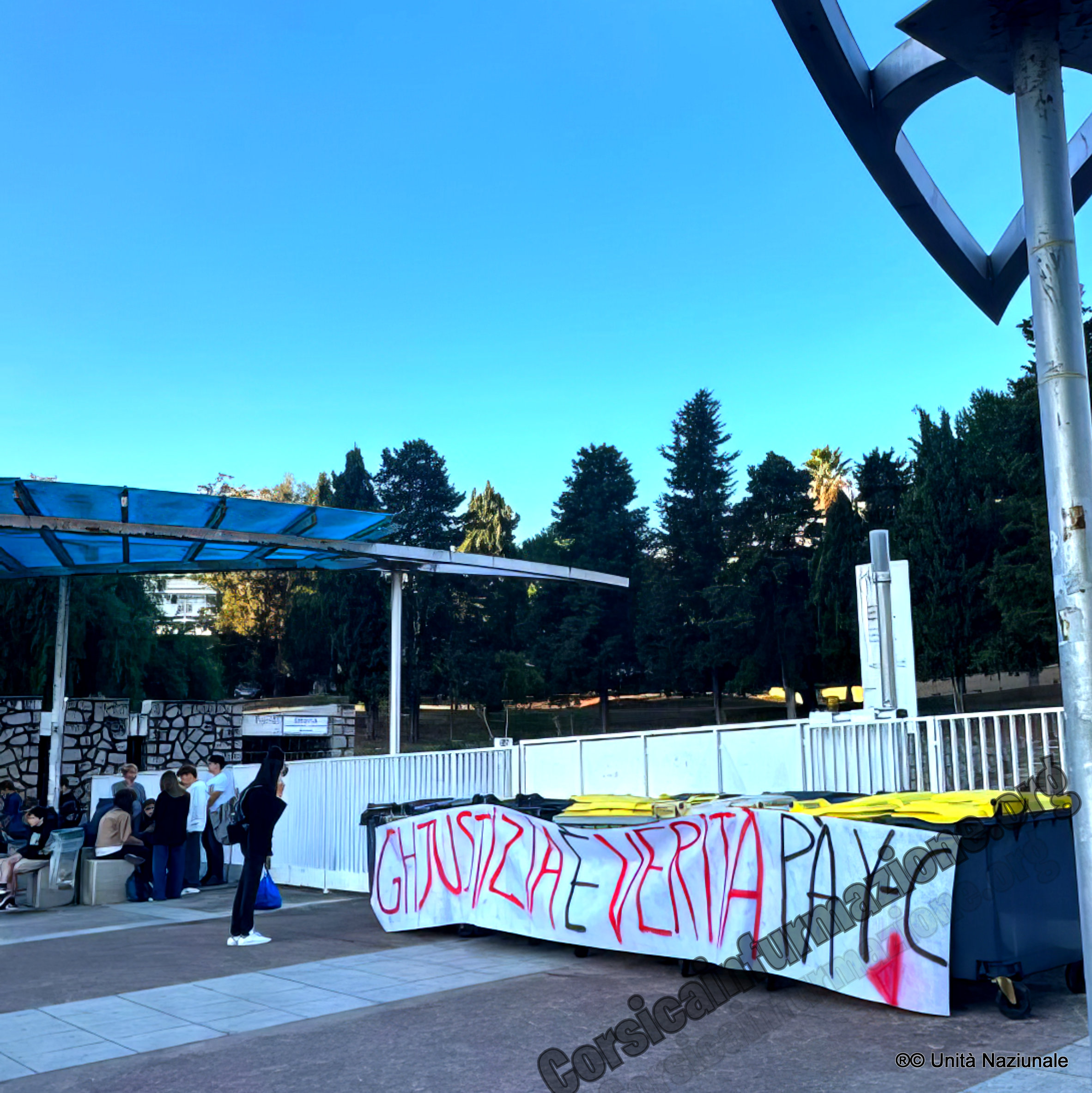 (Corse Net Infos) « Statu francese assassinu ». « Ghjustizia è verità pà YC ». Ce jeudi matin, les entrées des lycées Fesch et Laetitia à Ajaccio, de Montesoro à Bastia, ainsi que celles des établissements de Corte et Porto-Vecchio, ont été bloquées à l’aide de conteneurs et de banderoles.