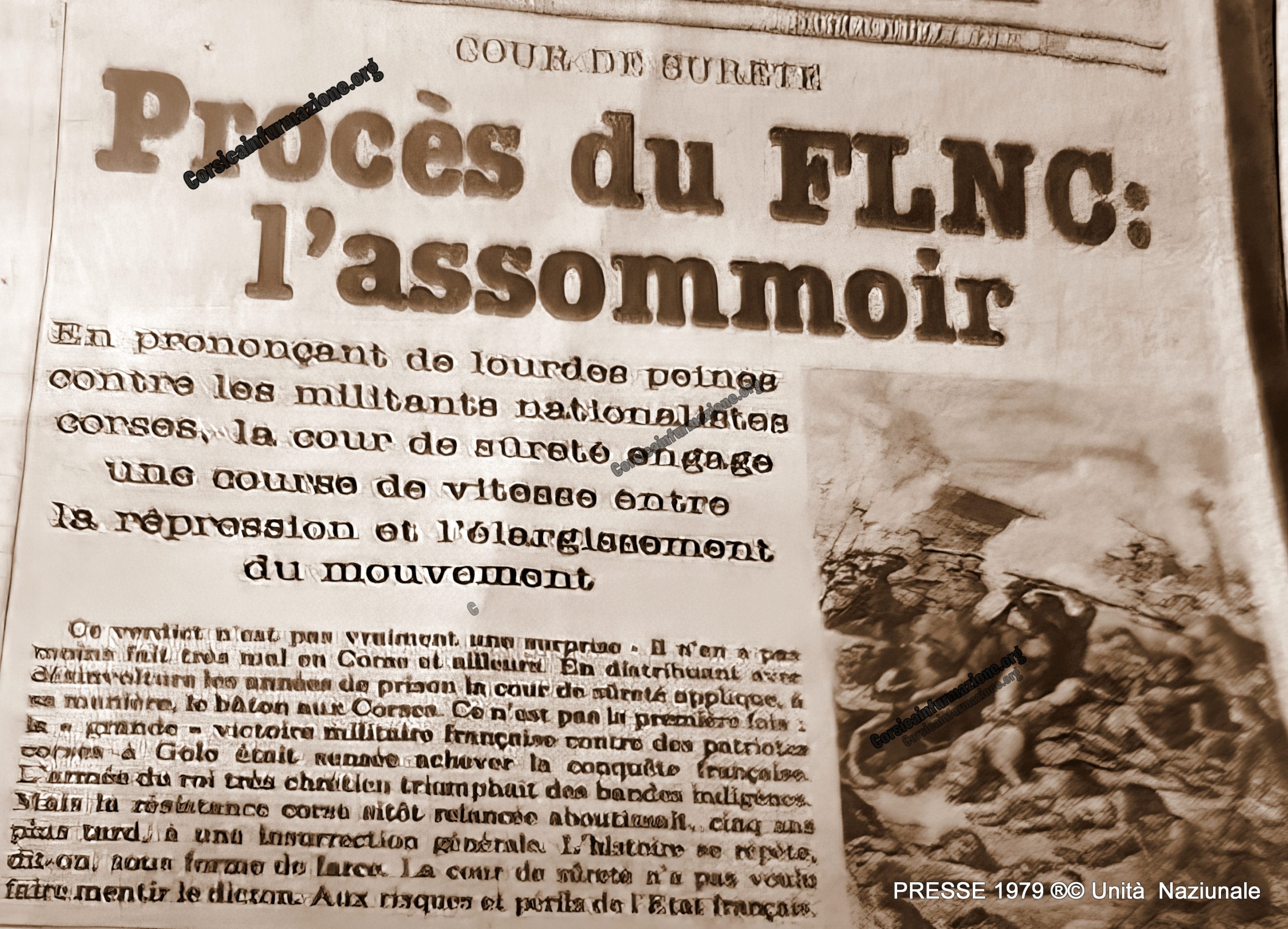 5 juillet 1979 : L’avocat général de la Cour de sûreté de l’État achève son réquisitoire contre les 21 membres présumés du Front de Libération Nationale de la Corse (FLNC), dans le cadre du procès qui se tient depuis le 14 juin 1979 à Paris. 15 à 20 ans de réclusion criminelle contre les principaux accusés Mathieu-Dominique Filidori, François Lorenzi et Jean-Paul Roesch. 5 à 10 ans de détention contre certains accusés dont Michel Padovani, Pierre Lorenzi, Jean-Toussaint Casamata et Jean-Toussaint Sisti.