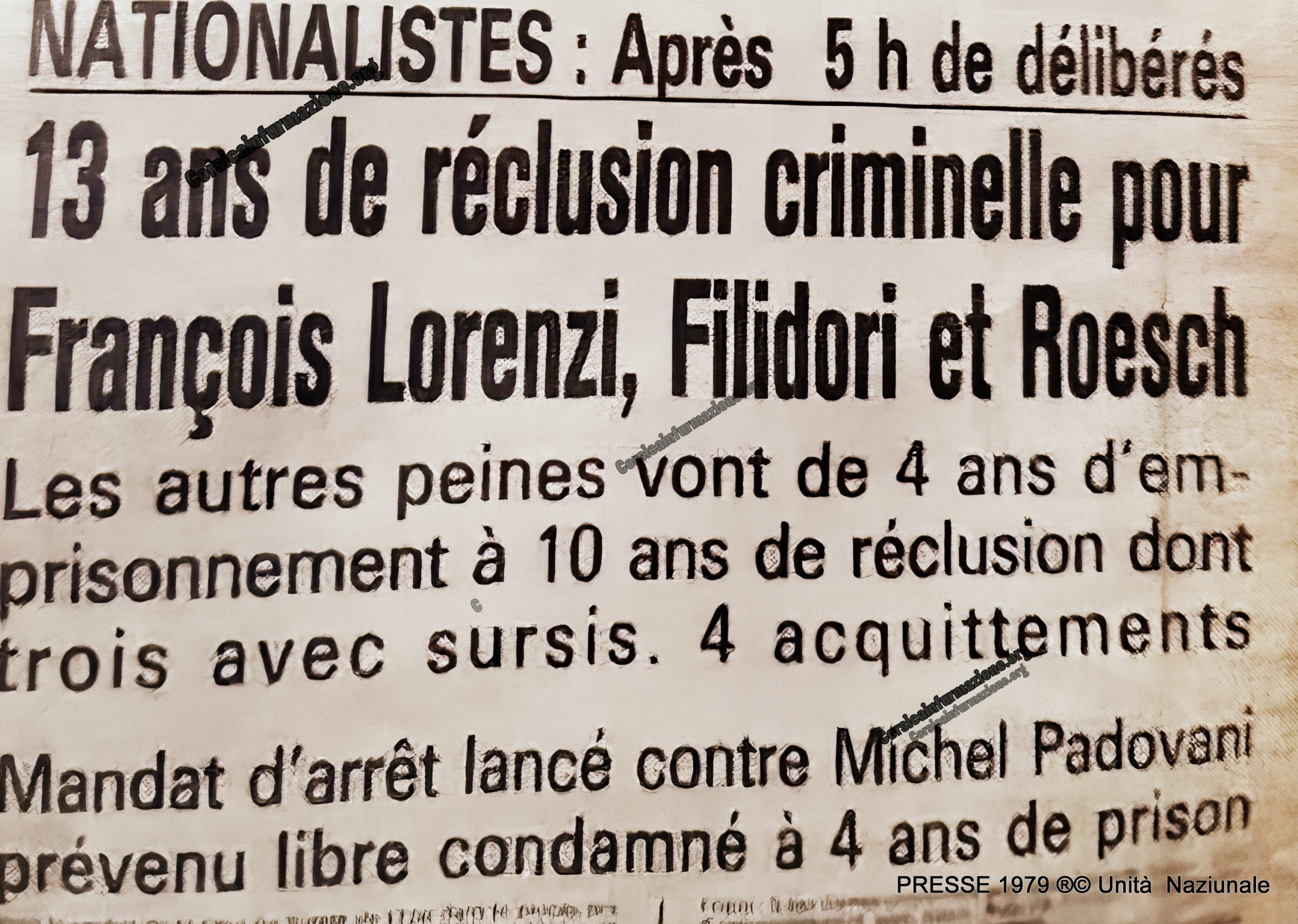 Lors de ce procès, Jean-Paul Roesch est condamné à 13 ans de réclusion criminelle pour son appartenance au FLNC. Michel Padovani comparaissant libre (c’est-à-dire non détenu au moment du procès). Il ne s’est pas présenté à l’audience au dernier moment devant les magistrats. La Cour a décerné un mandat d’arrêt à son encontre et l’a condamné à 4 ans de détention.