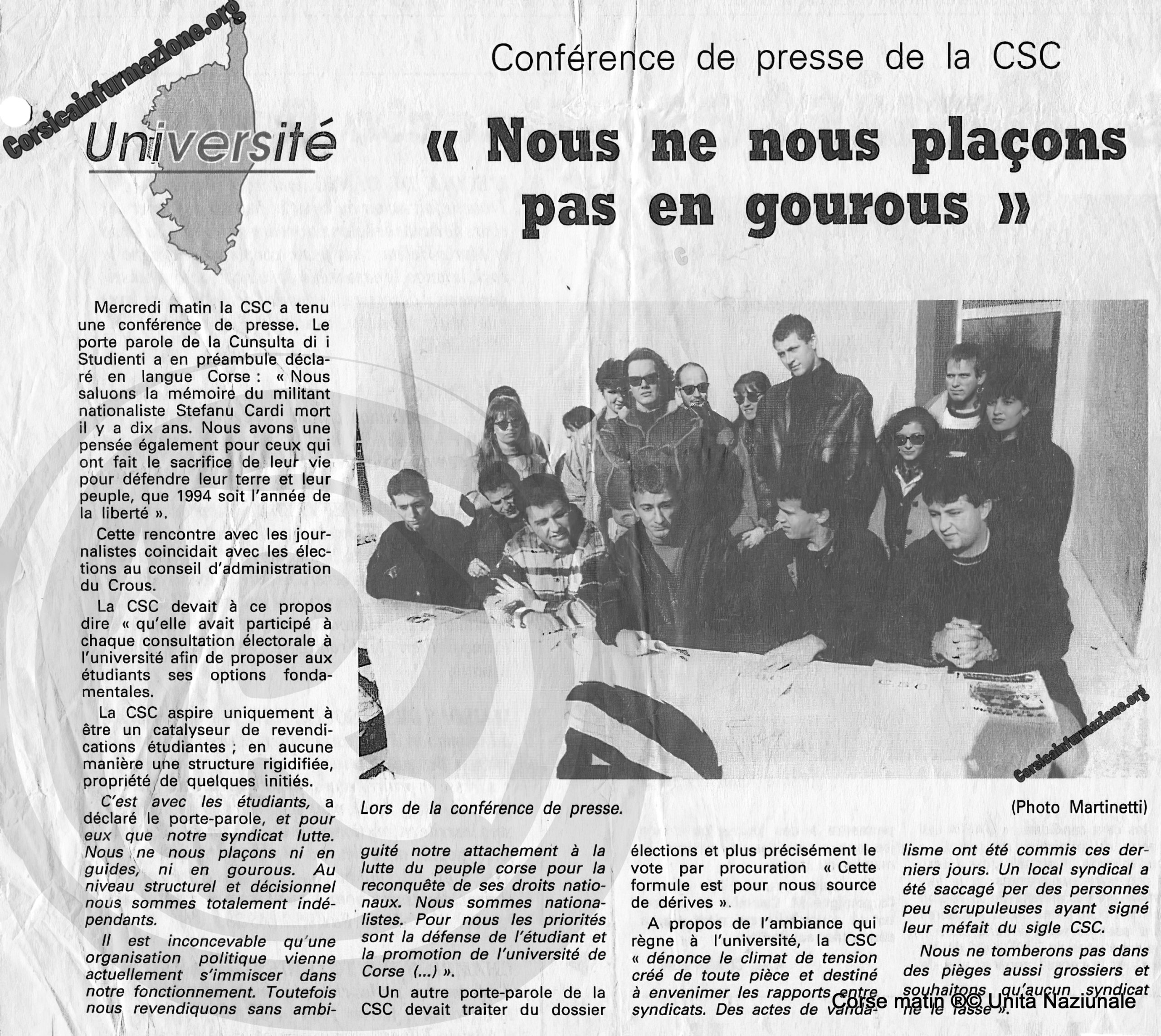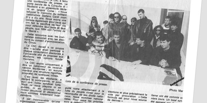 (Corsicainfurmazione.org, Unità Naziunale, publié le mercredi 12 janvier 1994) L’article de Corse Matin de janvier 1994, rapporte une conférence de presse tenue par la CSC (Cunsulta di i Studienti Corsi) à l’université le mercredi 12 janvier (sous réserve).