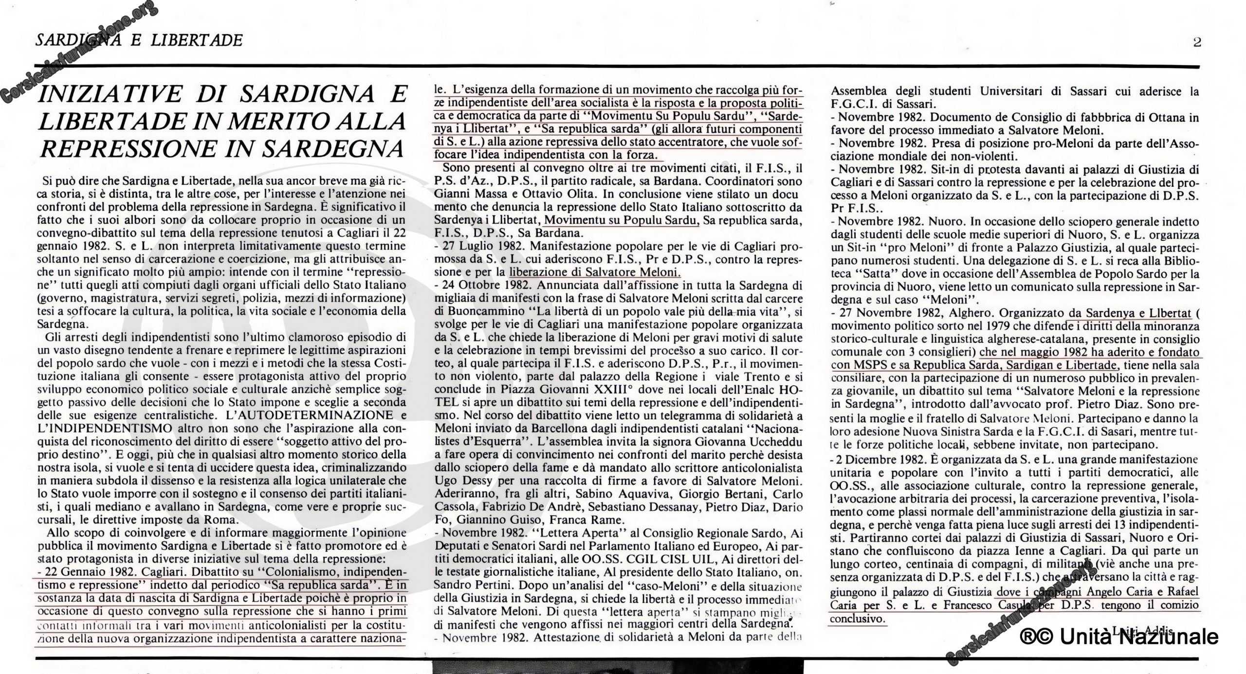 – Novembre 1982. Sit-in di protesta davanti ai palazzi di Giustizia di Cagliari e di Sassari contro la repressione e per la celebrazione del processo a Meloni organizzato da S. e L., con la partecipazione di D.P.S., F.I.S..