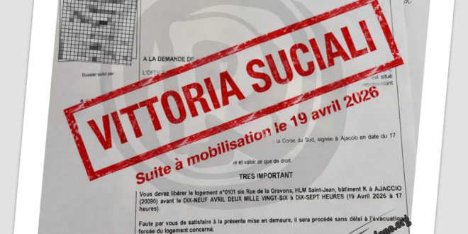 (Corsicainfurmazione.org, Unità Naziunale, Publié le 20 avril 2026) À Aiacciu, dans le quartier Saint-Jean, une nouvelle tentative d’expulsion est venue rappeler la brutalité persistante des logiques administratives face aux réalités sociales. Un homme d’une soixantaine d’années, sans solution de logement, était sommé de quitter un appartement HLM resté vacant, sous l’injonction conjointe des services de l’État et de l’office public de l’habitat. L’ultimatum, fixé au 19 avril à 17 heures, annonçait une expulsion imminente, exécutable par la force.