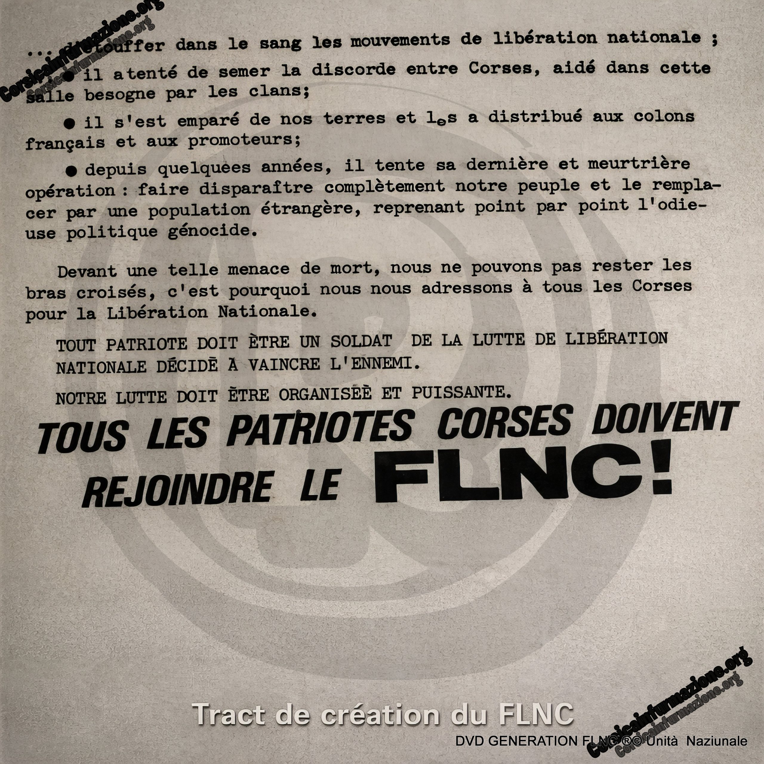 Devant une tette menace de mort, nous ne pouvons pas rester les bras croisés. C’ est pourquoi nous nous adressons à tous les corses pour la libération nationale. Tout patriote doit être un soldat de la lutte de libération nationale décidé à vaincre l’ennemi.