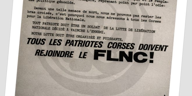 (Unità Naziunale Publié le 5 mai 1976) Le Front de Libération Nationale de la Corse a été créé le 5 mai 1976. À cette date, il publiait un premier manifeste annonçant un programme en 5 points. Le texte du tract : Peuple Corse Une étape décisive dans la lutte de libération nationale de notre peuple a … Lire la suite de #Corse « Manifeste du 5 Mai 1976 » – Tract création du FLNC en 1976